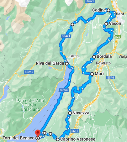 Uferstraße entlang des Gardasees, dann im Sarche-Tal nach Trient und weiter im Etsch-Tal bis nach Bozen. So gut es geht, wird Bozen und Meran