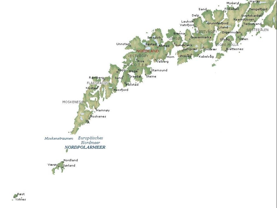 Südlich des Mahlstromes Moskenesstraumen liegt die Insel Værøy, deren von der Eiszeit gerundeten Berge sich steil aus dem Nordmeer erheben. Dort leben 820 Menschen und Huntertausende von Seevögeln. Hauptort der Insel ist Sørland. Im Sommer gibt es eine Fährverbindung nach Røst, Moskenes und Bodø.